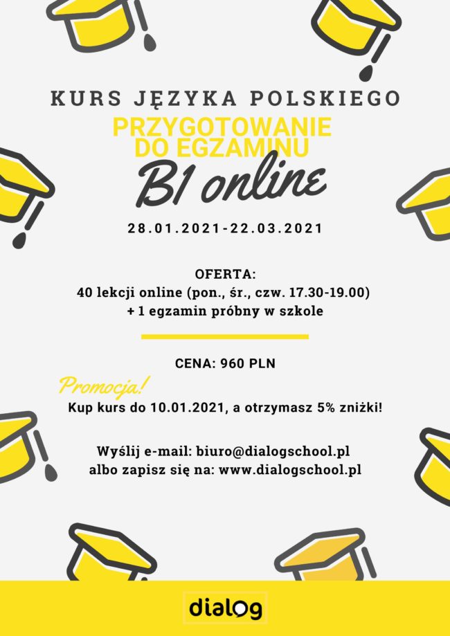 Drodzy Studenci, czas pomyśleć o egzaminie certyfikatowym B1 w marcu. Już 28.01.2021 ruszamy z nowym kursem online przygotowującym do egzaminu certyfikatowego na poziomie B1. W cenie 960 zł: 40 lekcji online, próbny egzamin, opieka metodyczna nauczyciela poza lekcją, czyli sprawdzanie prac pisemnych, zadań testowych, wyjaśnianie problemów gramatycznych i dla zainteresowanych przygotowanie dodatkowych ćwiczeń. Serdecznie zachęcamy…